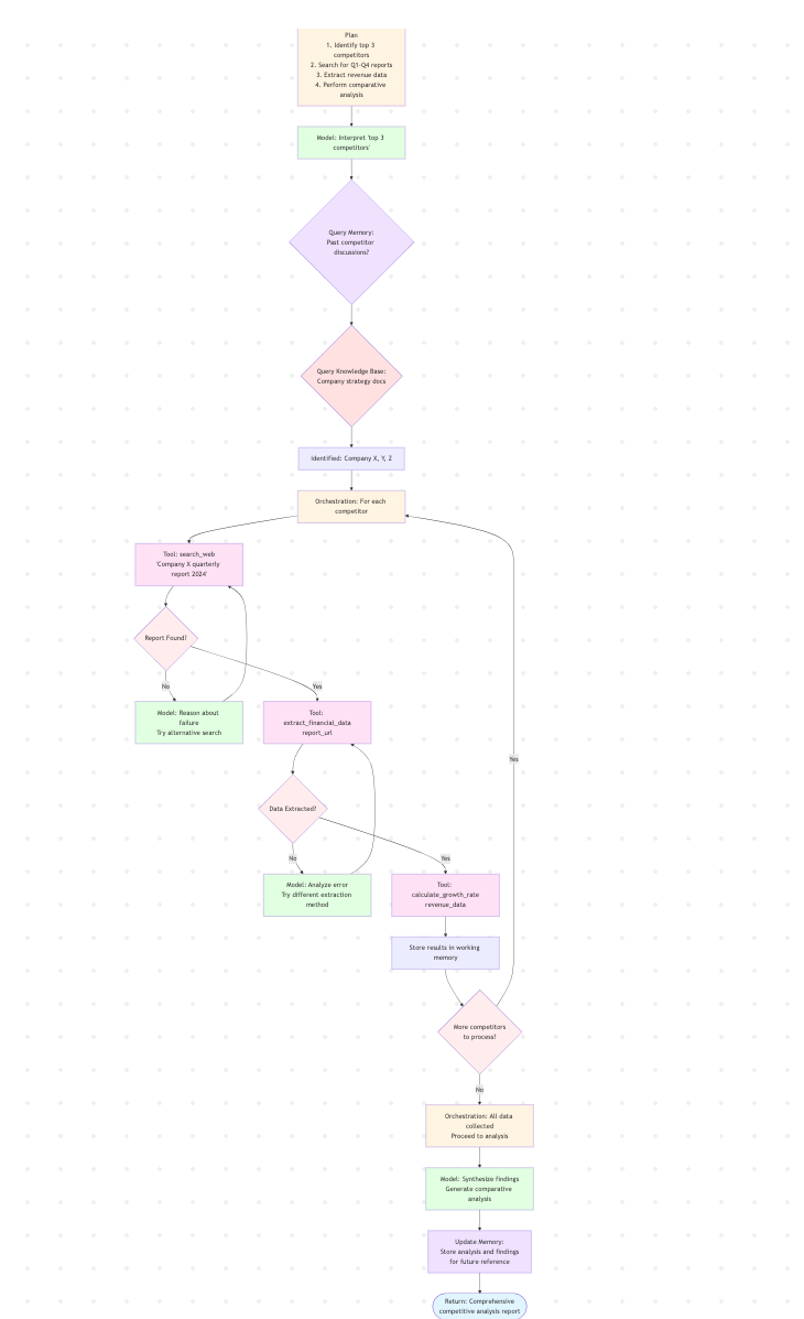 Model is invoked to interpret “top 3 competitors” in context. It references Memory (past conversations about competitors) and Knowledge Base (company strategy docs defining competitors)