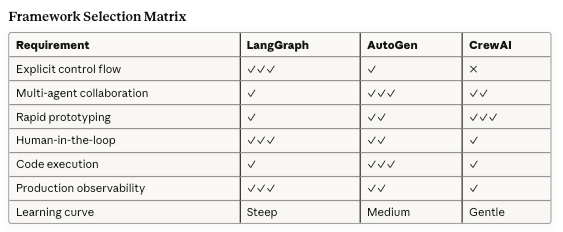 The framework choice matters less than you think. LangGraph, AutoGen, and CrewAI all solve the same fundamental problem—coordinating LLM calls with tools and memory. They make different trade-offs, but a skilled team can build production systems with any of them. What matters is understanding your trade-offs: Do you need explicit control or rapid iteration? Human-in-the-loop or full autonomy? Multi-agent collaboration or single-agent workflows?