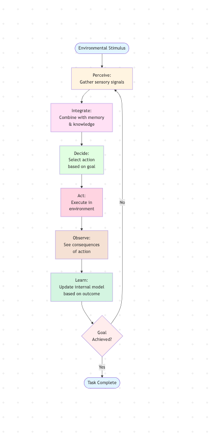 Perception: Agents receive user input and environmental signals (tool results, errors)
