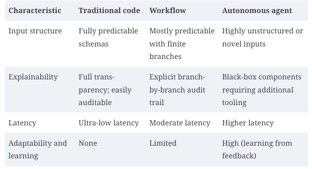 Real-world example: Order fulfillment systems, insurance claim processing, loan approval pipelines. These domains have established business rules and regulatory requirements that demand audit trails and deterministic behavior.
