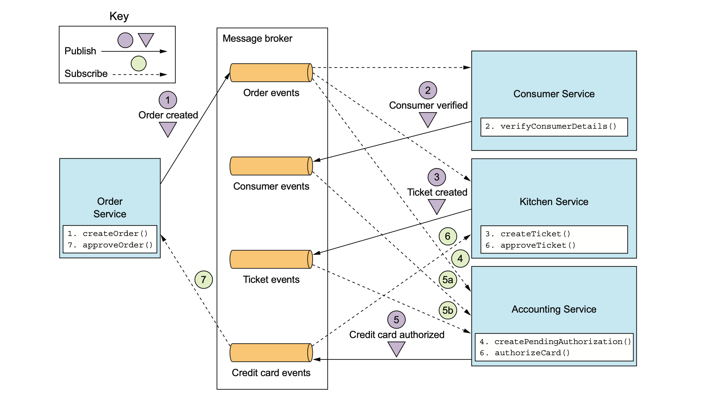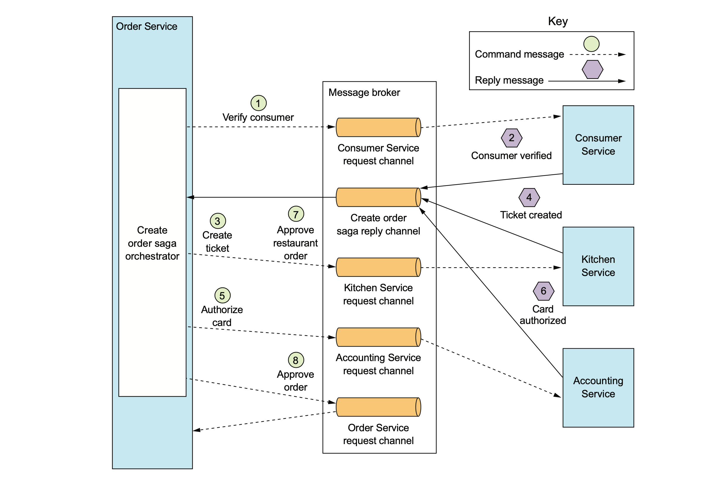 Consumer Service consumes the OrderCreated event, verifies that the con- sumer can place the order, and publishes a ConsumerVerified event.
